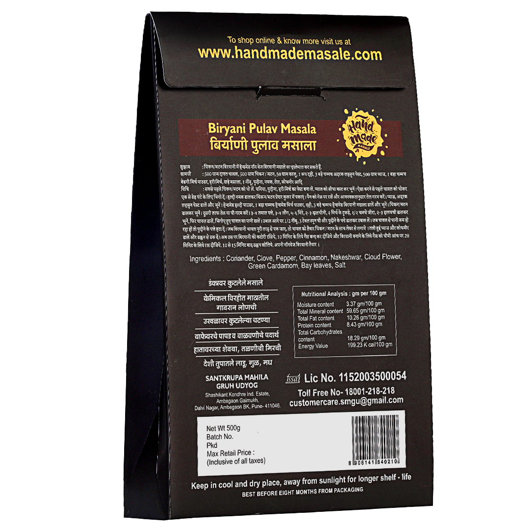 - Create aromatic & flavorful Biryani or Pulav with Handmade Masale's premium spice blend. This handcrafted masala ensures authentic taste for your favorite Indian rice dishes.