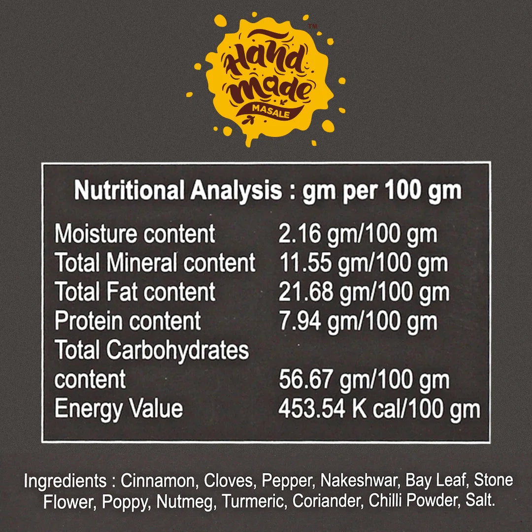 • Ingredients:Cinnamon,Clove,Pepper,Nakeshwar,Bay Leaf,Stone Flower,Poppy,Nutmeg,Turmeric,Coriander,Chilli Powder,Salt
