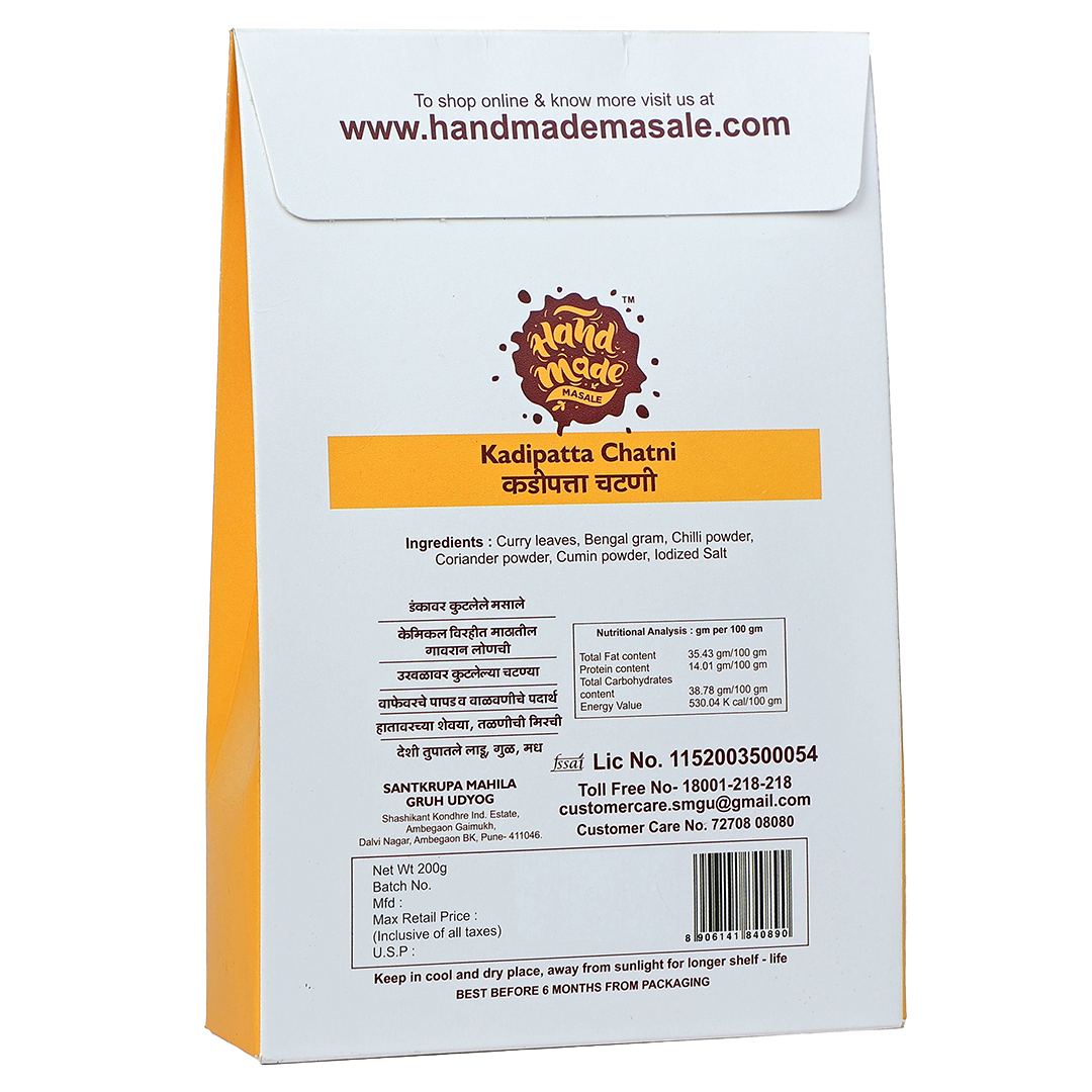 - Enhance your meals with Handmade Masale's authentic Kadipatta Chutney. Made with fresh curry leaves, this premium, handcrafted condiment offers a unique and aromatic flavor to Indian dishes.