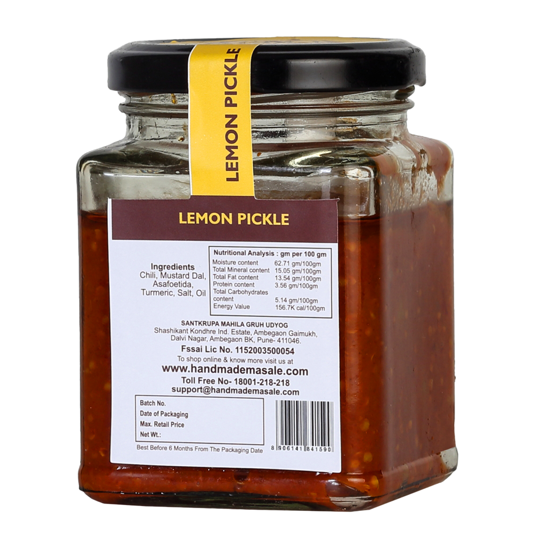 - Authentic Flavors: Handmade Masala Lemon Pickle, made with love by Sant Krupa Mahila Udyog, a women's self-help group established in 1999.