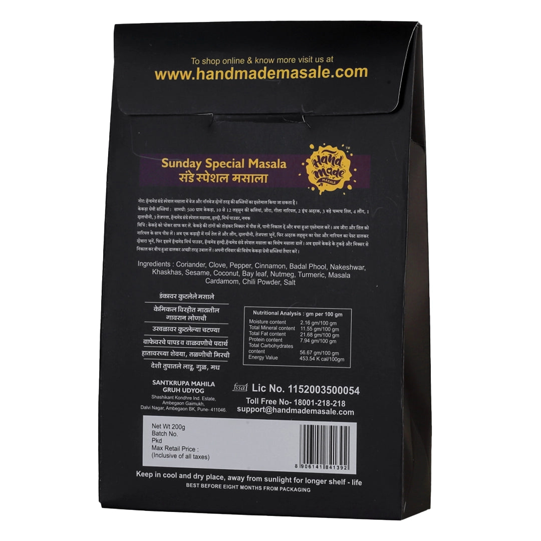 - Handmade Tradition, Weekend Feasts: Crafted by Sant Krupa Mahila Udyog, a women's self-help group founded in 1999, Handmade Masala's Sunday Masala brings generations-old recipes to your kitchen for delicious weekend meals.